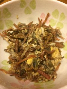 5 醤油で軽く炒めて、最後に溶かした卵をかけて炒める。