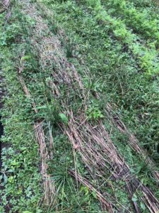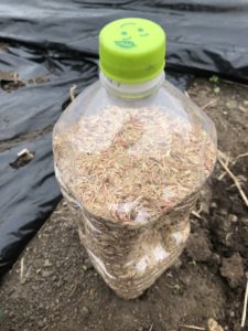 そして畝間(通り道 畝と畝の間のこと)に緑肥作物を蒔きます。(クリムソンクローバー オーチャードグラス 赤クローバー メジウム エン麦 ライ麦)