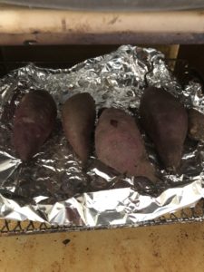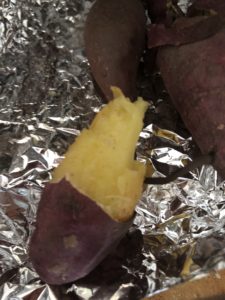 アルミホイルを敷き、そこにサツマイモを乗せてオーブントースターで30~40分焼き上げる。