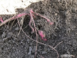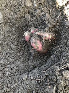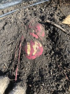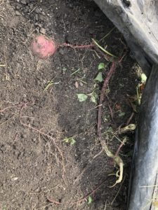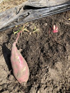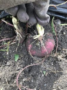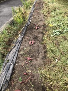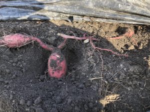 マルチを剥がすとサツマイモが出てきました。掘って収穫していきます。