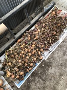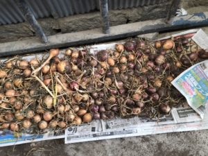 吊し上げ出来ない玉ねぎは、新聞紙を敷いて、干します。
