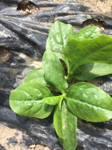 ツルムラサキはその柔らかい側枝(わき芽)の部分を食べるので摘芯したほうがわき芽がいっぱい出て収穫量が上がります。