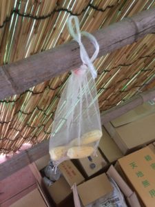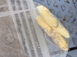 トウモロコシを網に入れ、風通しの良く、雨の当たらない日陰で干します。