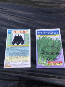 ・立石中長茄子とにらを一緒の植え穴に蒔きます。