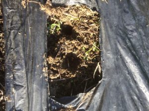 1穴に自家採種ナス2~3粒とニラ2~3粒を蒔きました。