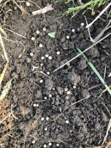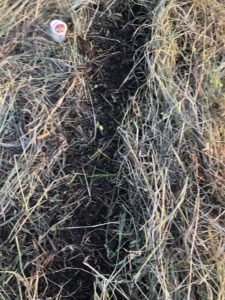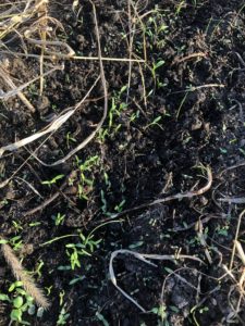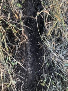 畝に溝を作り、そこに蒔いていきます。(すじ蒔き)