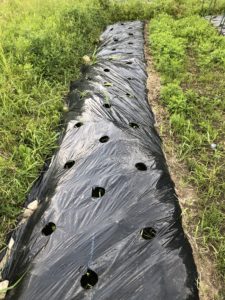 条間30cm、株間30cm間隔でマルチ穴開け器で、穴を開いていきます。