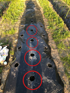 条間30cm、株間30cm間隔でマルチ穴開け器で、穴を開いていきます。