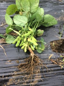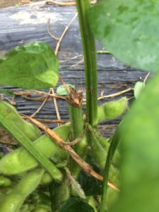今日は枝豆を収穫していきます。7~8割程度の枝豆のサヤが大きく膨らむと収穫のサインになります。