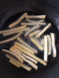 フライパンに油を入れて、こんがり茶色になるまで揚げていきます。
