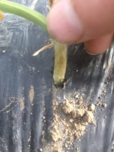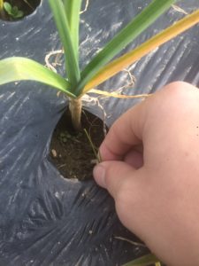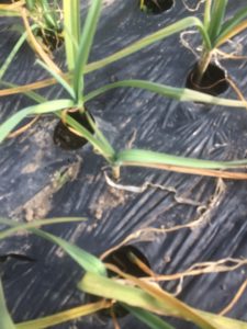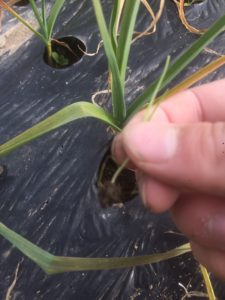 ニンニクが穴あきのところ以外から芽が出ていました。