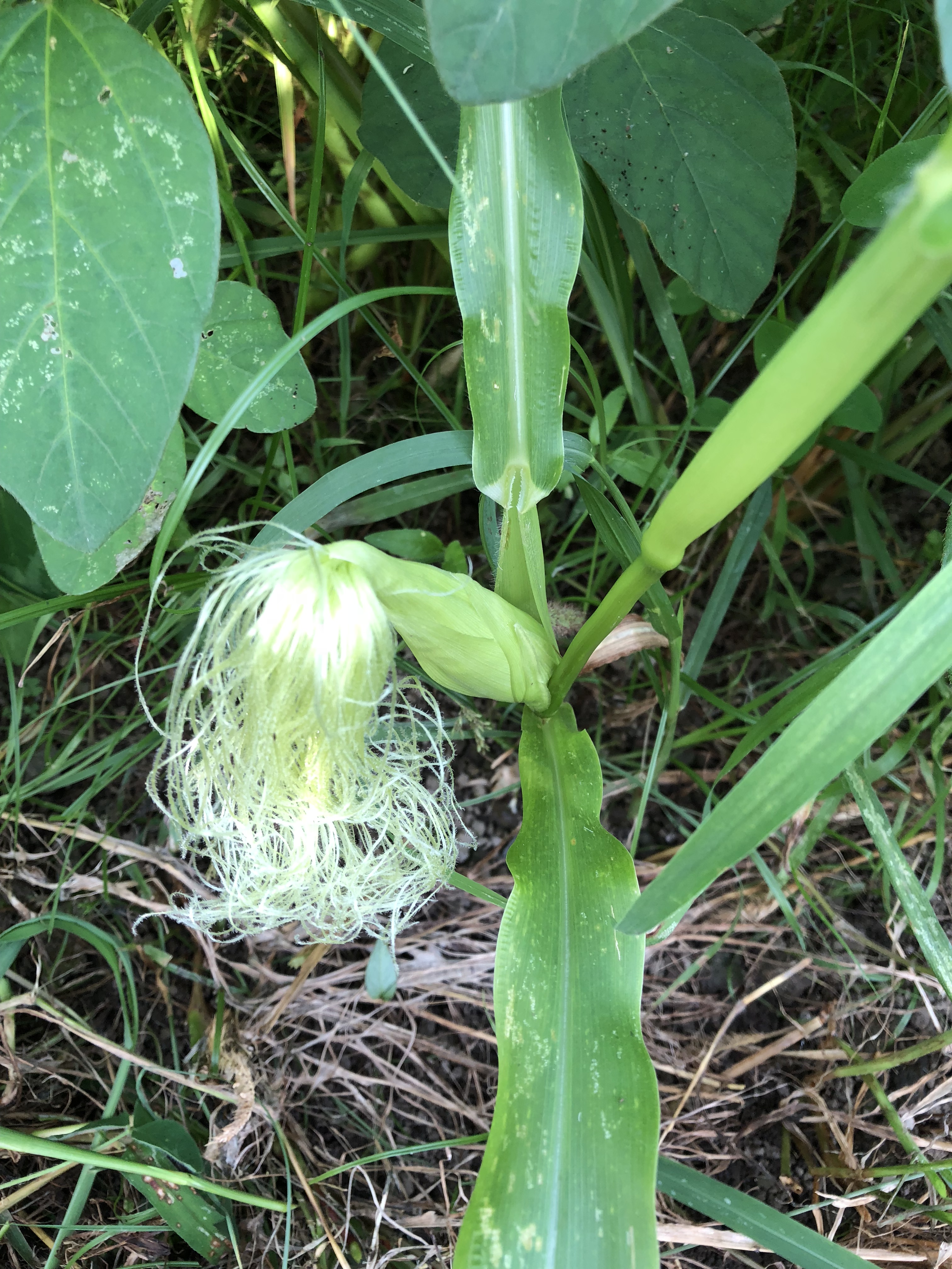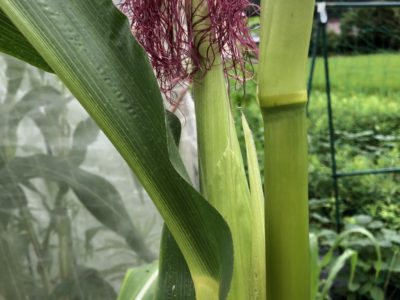 トウモロコシと枝豆の様子です。   雄花が付き、 白いひげのような雌花が出てきました。 そろそろトウモロコシが ...